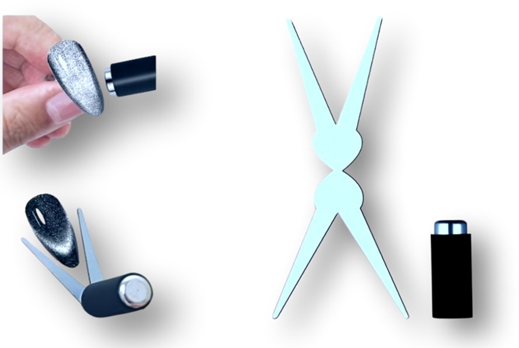 Dieses Tool besteht aus zwei Teilen. Der Zylinder-Magnet wird auf der Mitte des French-Metalls platziert und mit etwas Abstand an die Spitze des Fingernagels gehalten. So entsteht in dem Cat-Eye-Gel eine Smile-Line.