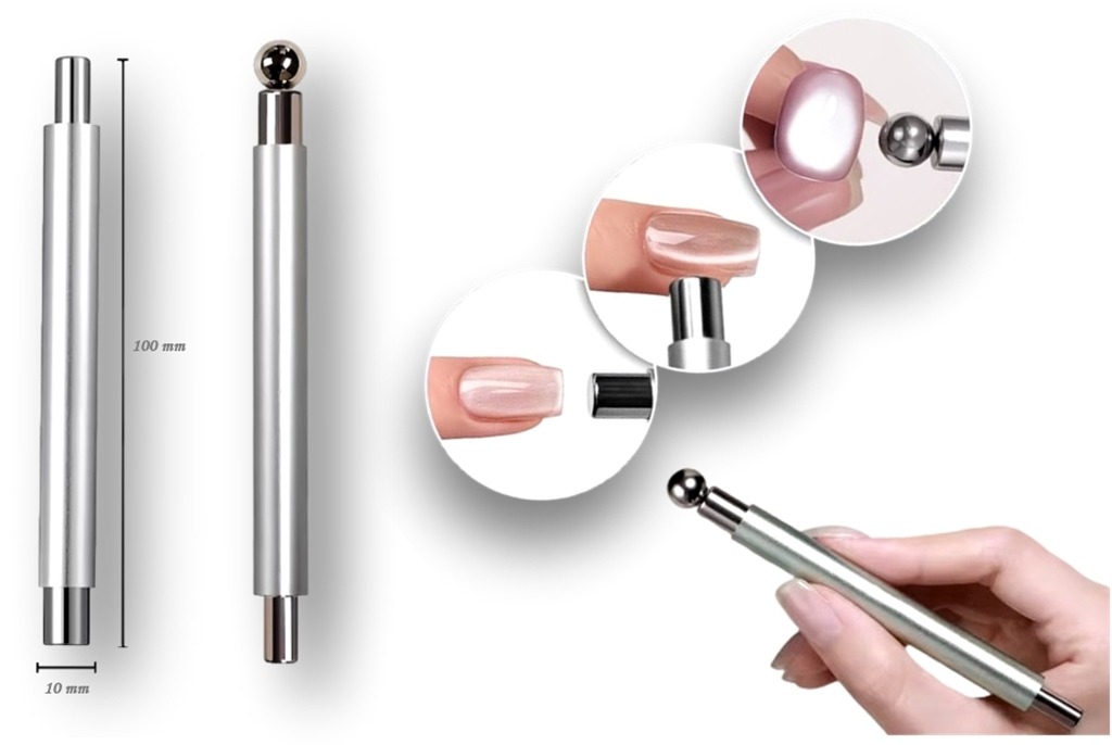 Dieser Magnet besteht aus zwei Teilen. Der Magnet-Stab wird über oder seitlich des aufgetragenen Cat-Eye-Gels langgeführt. So wird das Cat-Eye-Gel aktiviert und es entstehen verschiedene Cat-Eye-Effekte.Auf eines der Enden des Magnet-Stabs kann die Kugel aufgesetzt werden - so hat man eine weitere Möglichkeit, um Cat-Eye-Muster entstehen zu lassen. Zum Erstellen von Cat-Eye-Effekten wird der Magnet ca. 10 Sekunden in gewünschter Weise über das noch NICHT ausgehärtete Cat-Eye-Gel gehalten. So lassen sich verschiedene Effekte designen. Sobald der gewünschte Effekt vorhanden ist wird das Gel ausgehärtet. Nach dem Aushärten lässt sich der Cat-Eye-Effekt nicht mehr verändern.