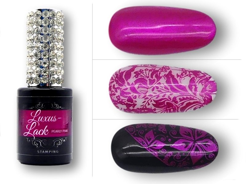 Hochpigmentierter Stampinglack in Luxus-Qualität - schimmerndes, kräftiges Pink. Mit unseren Luxus-Stamping-Lacken gelingt dir dein Stamping in gestochen scharfer Qualität. Selbst die filigransten und detailreichsten Muster übertragen sich 1 : 1 vom Stempel auf den Nagel.