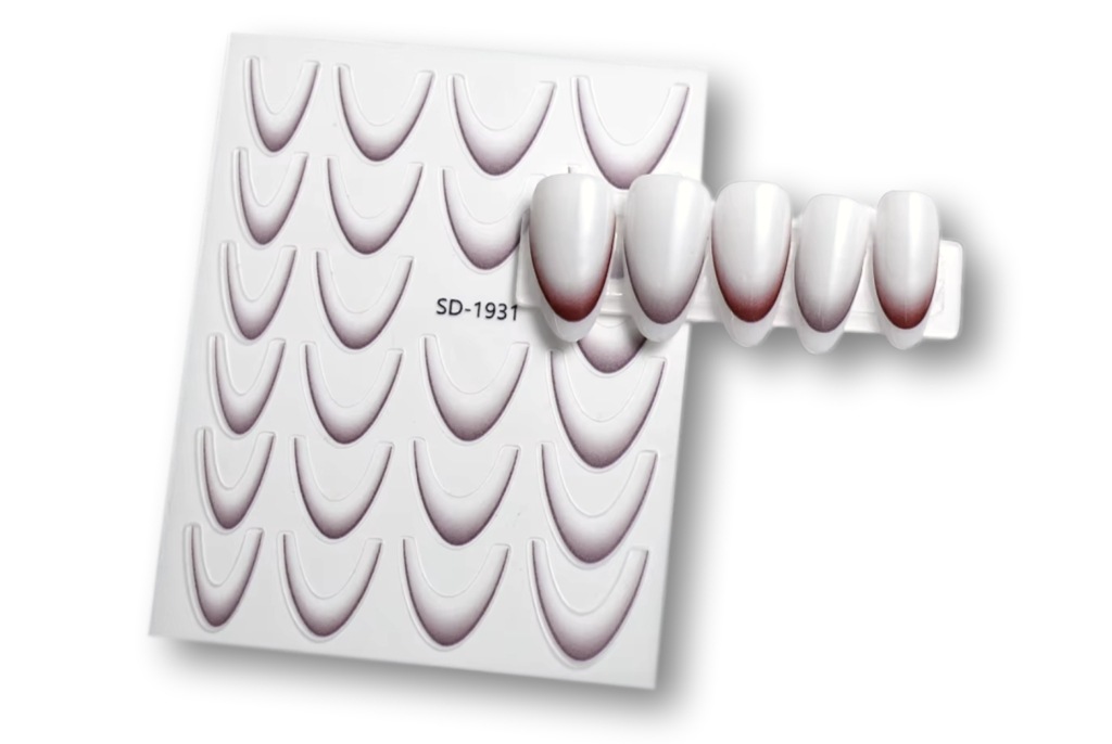 Selbstklebende, ultradünne Ombre/French-Sticker für die perfekte Smile-Line im Ombre-Style. Auf einem Bogen befinden sich 23 Sticker in verschiedenen Größen.