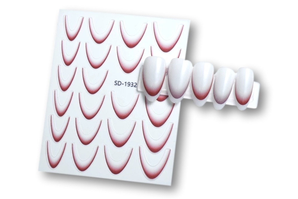 Selbstklebende, ultradünne Ombre/French-Sticker für die perfekte Smile-Line im Ombre-Style. Auf einem Bogen befinden sich 23 Sticker in verschiedenen Größen.