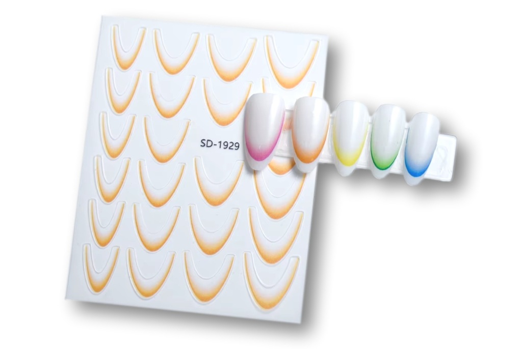 Selbstklebende, ultradünne Ombre/French-Sticker für die perfekte Smile-Line im Ombre-Style. Auf einem Bogen befinden sich 23 Sticker in verschiedenen Größen.