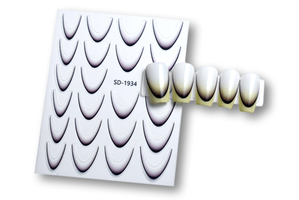 Selbstklebende, ultradünne Ombre/French-Sticker für die perfekte Smile-Line im Ombre-Style. Auf einem Bogen befinden sich 23 Sticker in verschiedenen Größen.